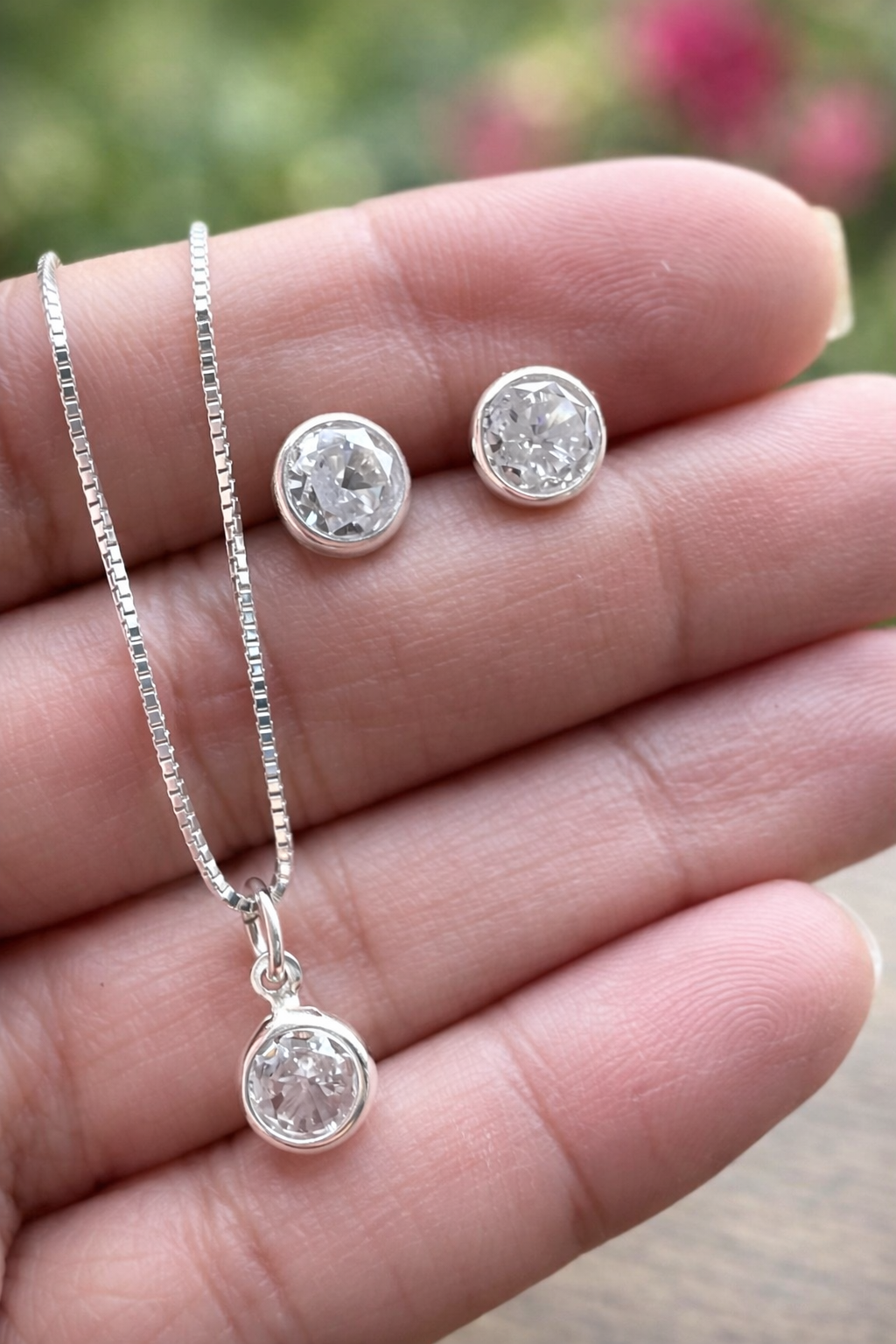 Conjunto Brinco e Corrente veneziana em Prata 925, com ponto de Luz Redondo de Zircônia